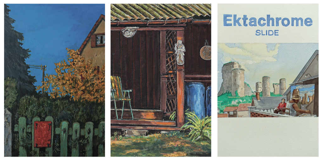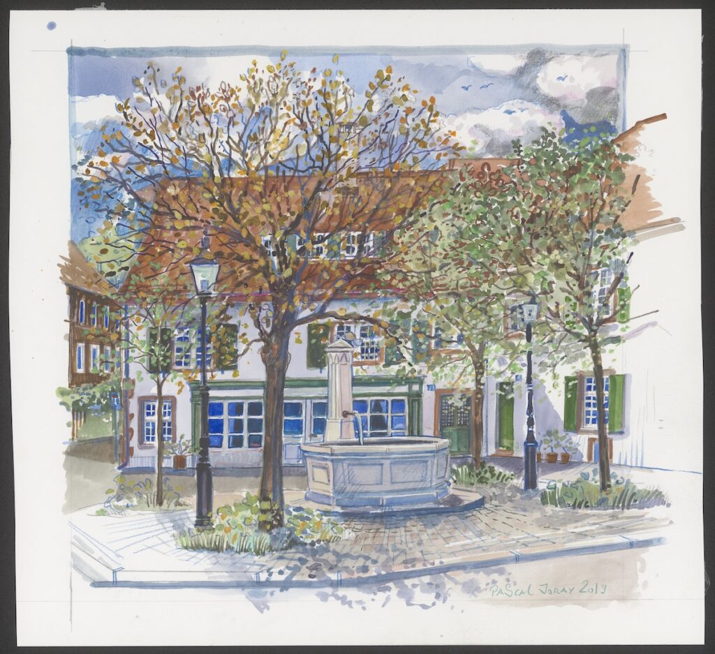 Ein Bild von den Diaquarellen aus der Serie 2019, die STÉPHANE BELZÈRE-KREIENBÜHL angefangen hat und weiterführt. Hier nach einem Diapositiv aus dem Familienbestand gemalt: mein Vater, das Schloss von Herisson (Mittelfrankreich, Département Allier) mit Porträt von Maurice Munzinger im Vordergrund.