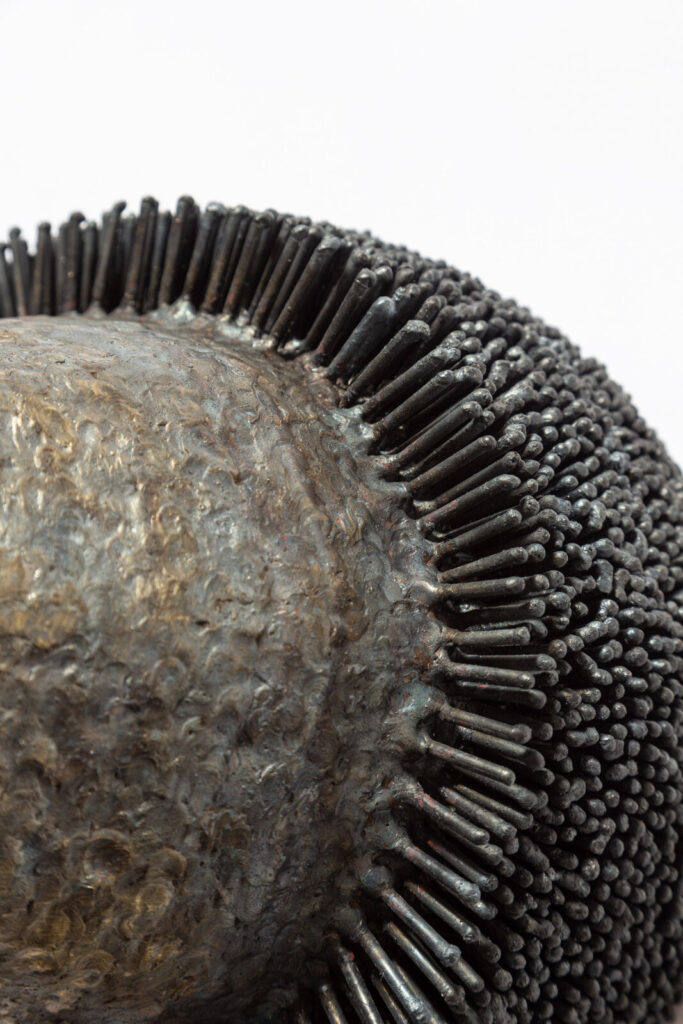 Die Eisenplastiken werden aus einzelnen Stäben geschweißt. Die offene Flamme macht das Eisen flüssig, es wird Tropfen für Tropfen verbunden, strukturiert. Es kühlt ab, wird fest. Die Hitze hinterlässt ihre Spur. Durch das sehr langsame Arbeiten, reift die Plastik. Was werden will hat Raum, Gestalt anzunehmen. Es entstehen Hüllen, Fragmente, Wandarbeiten, die sowohl offen, als auch geschlossen, in sich ruhend, stark und auch fragil sind. Glatt, samtig oder rau, grau oder rostig.
